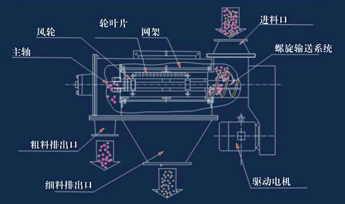 臥式氣旋篩的篩網為圓筒狀,置于機體內,物料通過螺旋輸送系統后,和氣流混合、霧化進入網筒內;通過網筒內風輪葉片使物料同時受離心力和旋風推進力,從而迫使物料噴射過網,由細料排出口排出,不能過網的物料沿筒壁從粗料排出口排出。
